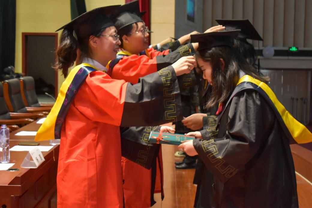 徐金强宣读了《关于表彰省级优秀学生、学生干部、优秀毕业生表彰决定》以及学校评定委员会关于授予学位的通知,对本届毕业生中表现优异的同学进行了表彰颁奖。毕业生们依次上台由学院学位评定分委员委员们一一为他们授予学位证书并为其拨穗正冠,全体毕业生向导师们鞠躬感谢。