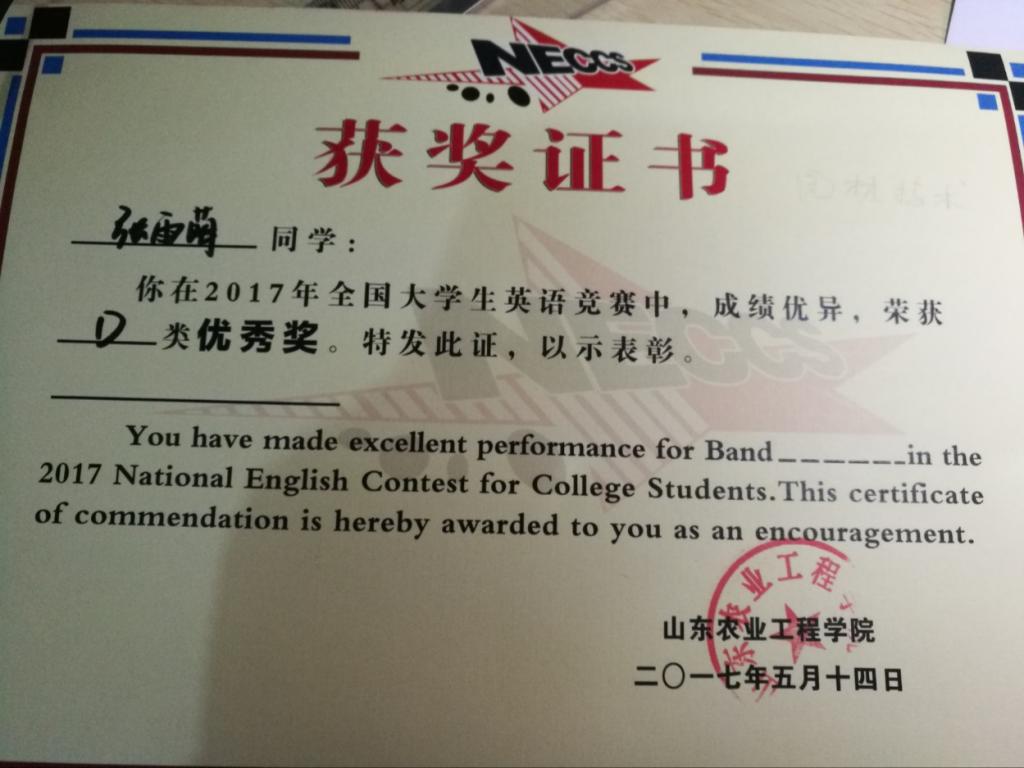 我院2016级园林技术专业张雨桐同学在2017年全国大学生英语竞赛中,荣获D类优秀奖。