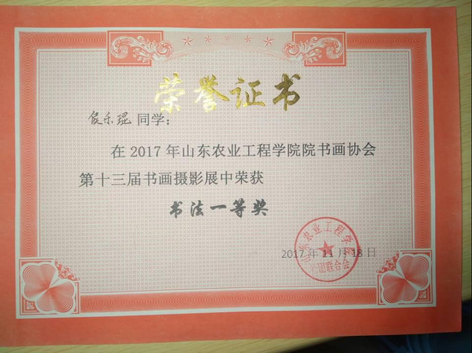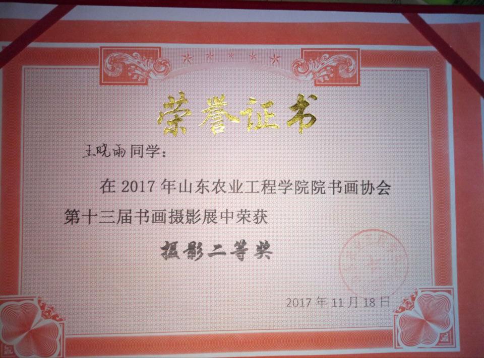 我院2017级植保专业侯乐琨同学在2017年学院书画协会第十三届书画摄影展中荣获书法一等奖,2017级植保专业王晓雨同学在2017年学校书画协会第十三届书画摄影展中获摄影二等奖。