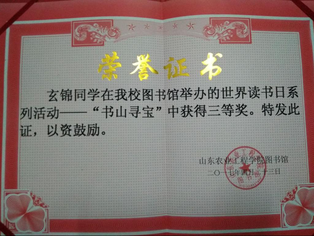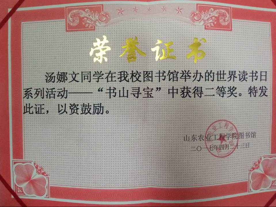 我院2016级风景园林汤娜文、玄锦等两名同学在图书馆举办的世界读书日系列活动——“书山寻宝”中获得二等奖。