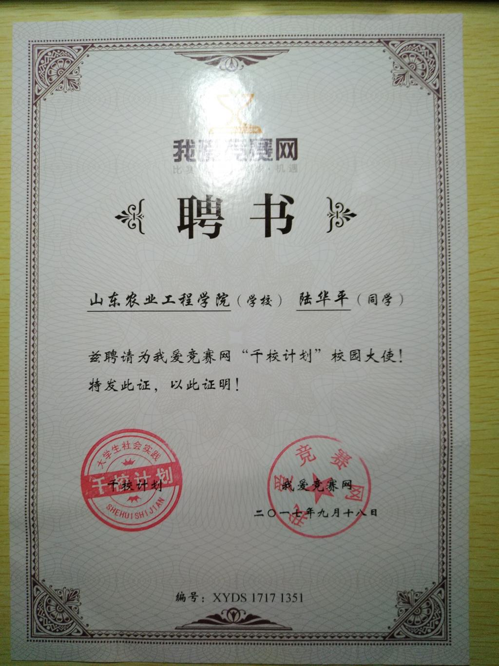 我院2016级园林技术专业陆华平同学2017年被聘请为我爱竞赛网“千校计划”校园大使。