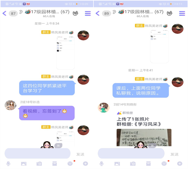 学生讨论情况和作业情况,老师都可以及时查看。对未完成作业的还可以给学生发消息督促。