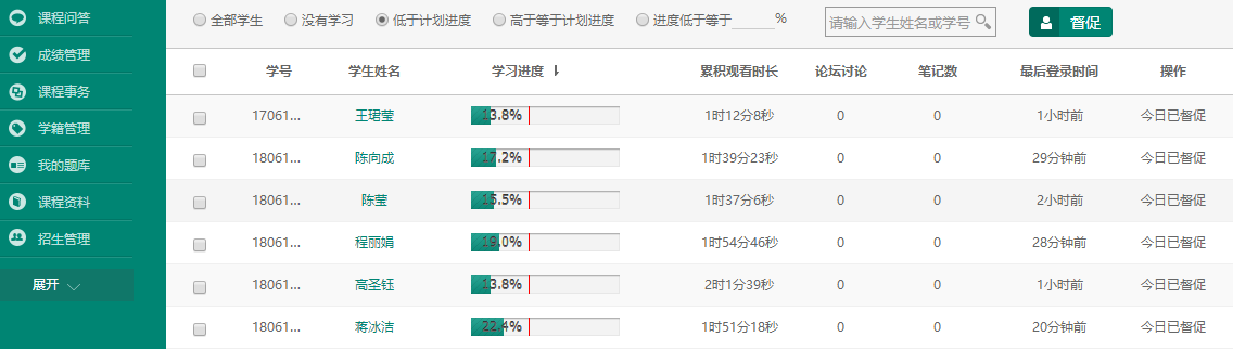 对于学习进度低于学习计划的同学,及时检查每天都进行督促,使这些同学有学习的紧迫感。