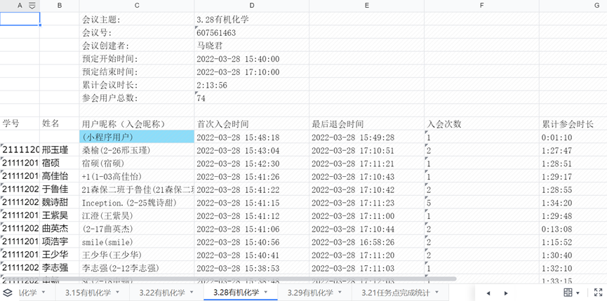 3.通过导出腾讯会议参会记录作为学生出勤文件。在一周两次课程学习完成后,将此文件上传到QQ群中,让学生填写学号与姓名;提醒迟到早退学生。