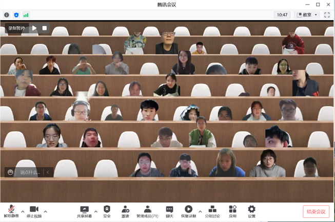 4.腾讯会议过程中要求学生开启摄像头,使用双设备直播:电脑端进行成员管理,平板端共享PPT进行讲解。