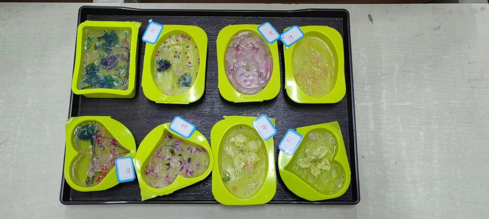 活动伊始,主持人向大家介绍手工皂的制作步骤和注意事项,随后,志愿者为参加活动的同学分发制作工具。大家对此次活动热情高涨、听完主持人的介绍后便跃跃欲试。虽材料有限,但创意无限,掬花叶在手,弄皂香满衣,同学们的创意与期待都融在作品之中,化成手工皂的精致与独特。