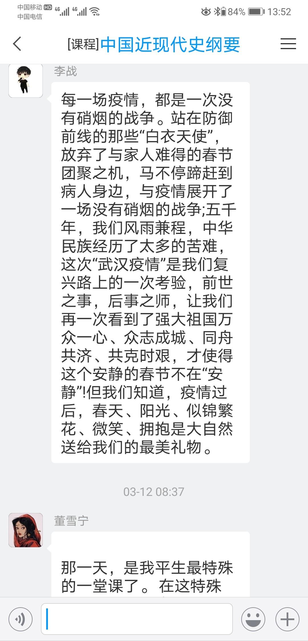 根据山东省教育厅《山东省教育厅关于组织参加“全国大学生同上一堂疫情防控思政大课”的通知》要求,教工第一党支部书记巨小雷带领党员教师组织学生收看了全国大学生疫情防控思政大课在线直播,并结合本学期思政课的授课内容组织了抗疫思政课大讨论。通过此次讨论,使大学生进一步传承和弘扬了爱国主义精神,进一步增强中国特色社会主义道路自信、理论自信、制度自信、文化自信。在线上直播和课上讨论中,同学们通过“学习通”的班级群聊等软件纷纷发表自己的见解,气氛热烈。