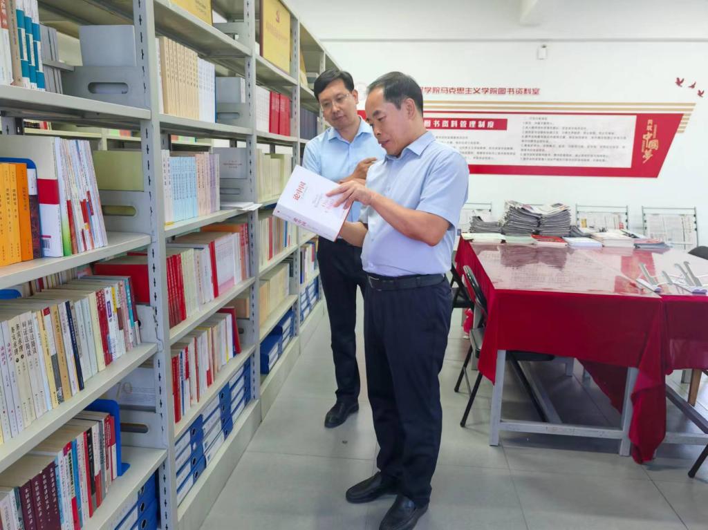 李进京实地考察了马克思主义学院的办公场所、文化墙建设、资料室等,听取了负责同志关于马克思主义学院建设的工作汇报,并与参会人员进行交流座谈。
