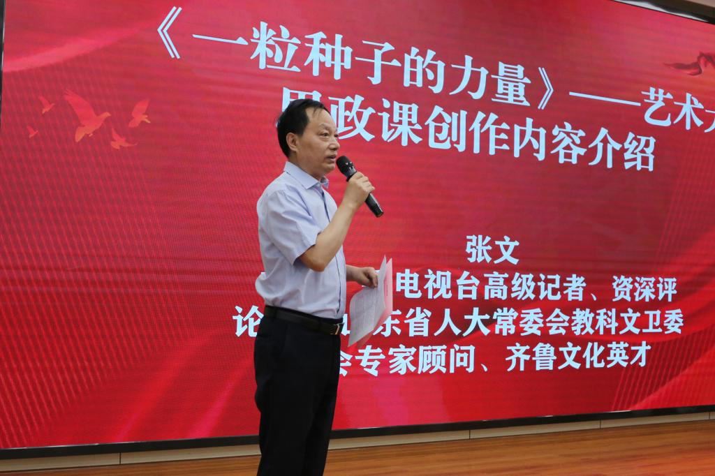 思政教育需要深耕者,亦需要传播者。山东广播电视台高级记者、资深评论员、山东省人大常委会教科文卫委员会专家顾问、齐鲁文化英才张文介绍了艺术大思政课的创作内容及特色亮点,全体师生共同观看“红动齐鲁”山东省红色故事讲解大赛艺术思政课成果展示《一粒种子的力量——中国共产党人精神谱系的齐鲁回响》,通过燎原、耕耘和丰收三个单元,将生动鲜活的红色故事通过艺术化的形式呈现,深刻诠释了中国共产党人精神谱系的实践伟力,展现了齐鲁大地红色文化魅力。