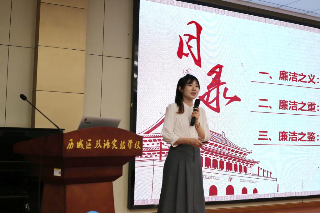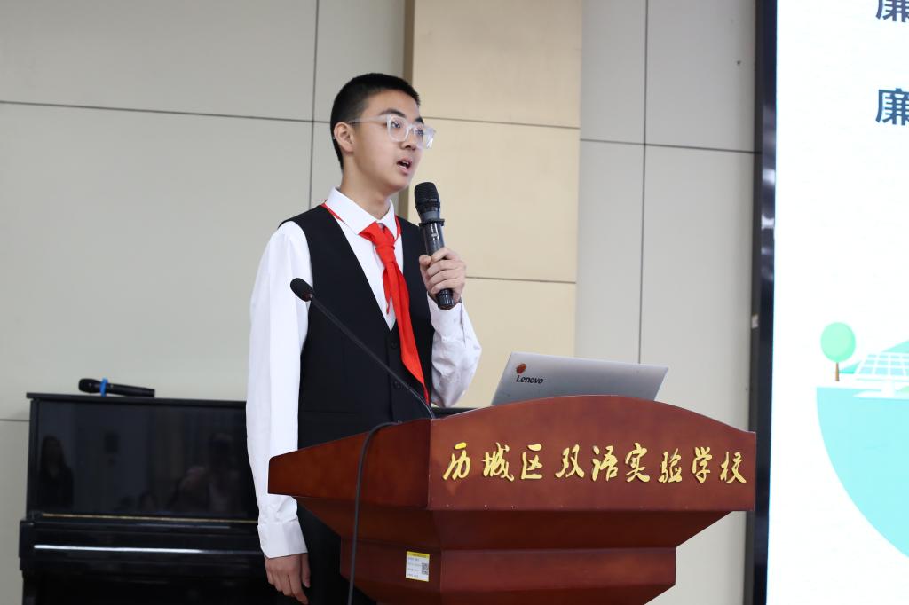 现场,437ccm必赢国际官网马克思主义学院教师李昕彤、历城区刘姑店小学副校长刘冰、历城区小辛小学副校长张雪荣、历城区祥泰实验学校教务处副主任程丽、刘姑店小学学生代表等依次上台进行廉洁主题宣讲,从多个层面深入解读了廉洁的内涵和意义,进一步增强了师生的廉洁意识,营造了风清气正的校园文化氛围。随后,历城区双语实验学校学生先后带来合唱《水母鸡》《少年中国梦》《住在心里的人》和朗诵《不朽》,生动展现了新时代学生积极向上的精神风貌。
