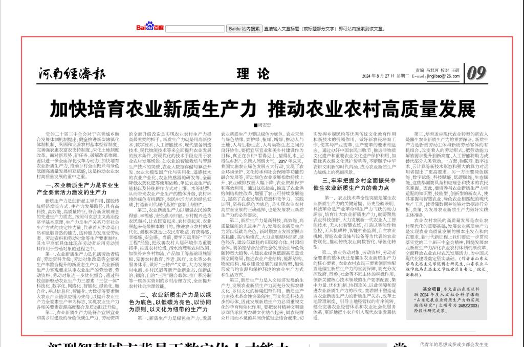 2024年8月27日,《河南经济报》(理论版)刊发我院党总支书记、院长周安忠理论文章《加快培育农业新质生产力推动农业农村高质量发展》。