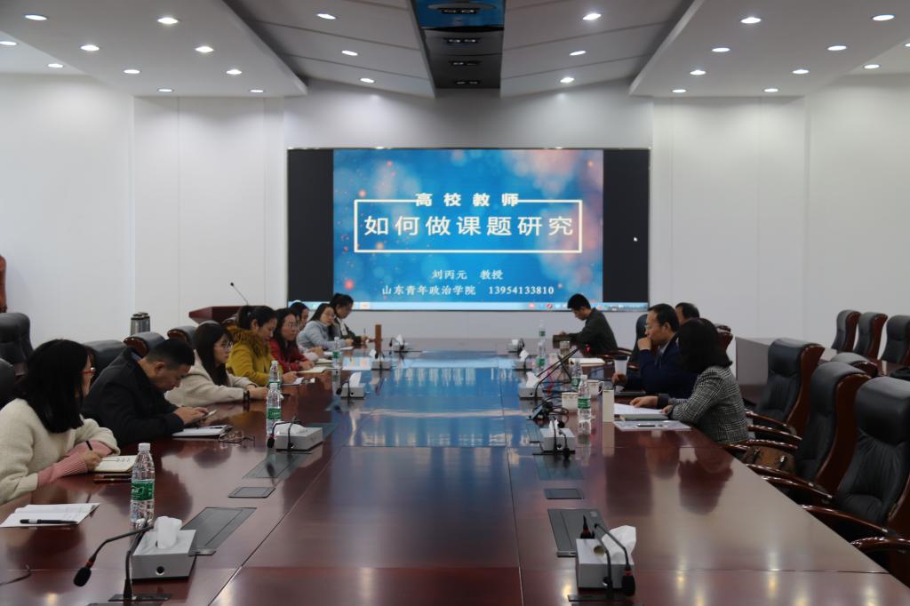 11月4日下午,马克思主义学院在办公楼第四会议室举办教师科研能力提升讲座暨评建交流座谈活动,活动特别邀请山东青年政治学院马克思主义学院院长刘丙元教授作题为《高校教师如何做课题研究》的专题讲座。学院党总支书记赵斌出席活动,学院院长唐欣主持活动并总结,学院全体教师参加讲座。