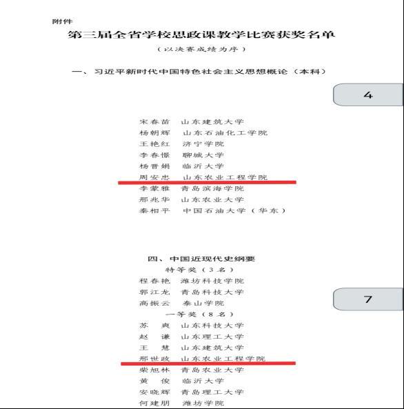 近日,山东省教育厅公示了第三届全省学校思想政治理论课教学比赛获奖人员名单,我院院长兼党总支书记周安忠荣获习近平新时代中国特色社会主义思想概论课程二等奖,邢世政老师荣获中国近现代史纲要课程一等奖。