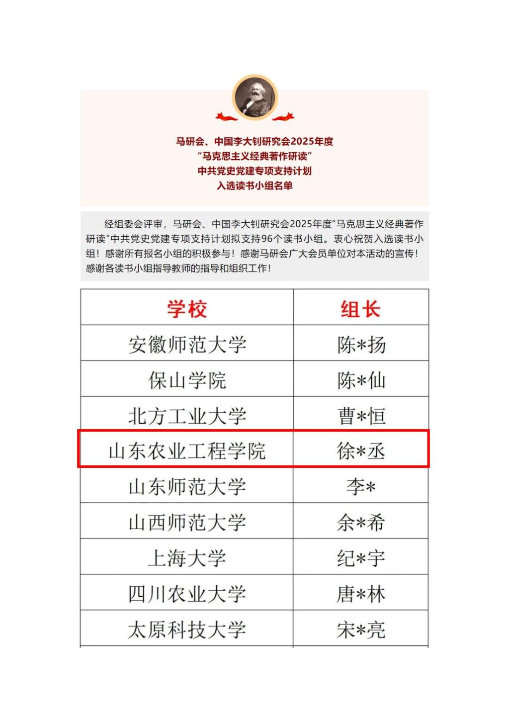 注:中国高等教育学会马克思主义研究分会是由教育部主管的国家一级学会——中国高等教育学会的分支机构,是全国高等教育领域唯一由教育部主管的马克思主义理论专业学会。“马克思主义经典著作研读”资助计划是由马克思主义研究会组织发起的读书小组资助活动。经组委会专家评审,来自北京大学、南京大学、吉林大学、兰州大学、中国社会科学院大学、山东师范大学等96个读书小组入选了2025年度“马克思主义经典著作研读”资助计划。