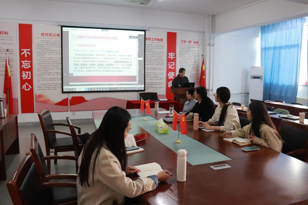 会上,支部书记刘丹丹给全体党员辅导学习《中国共产党纪律处分条例》,从纪律体系和纪律处分制度、《中国共产党纪律处分条例》的产生与发展、《中国共产党纪律处分条例》的基本内容等方面进行全面系统、重点突出的辅导,对全体党员深入学习、深刻理解《条例》具有非常好的指导作用。