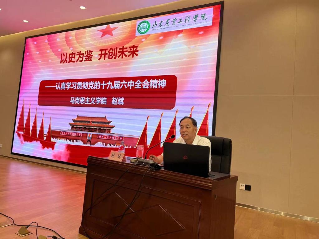 9月20日上午,我院党总支书记兼院长赵斌教授在淄博校区为学校承办的山东省乡村产业振兴带头人培育“头雁”项目社会化服务、蔬菜产业培训班宣讲党的十九届六中全会精神。