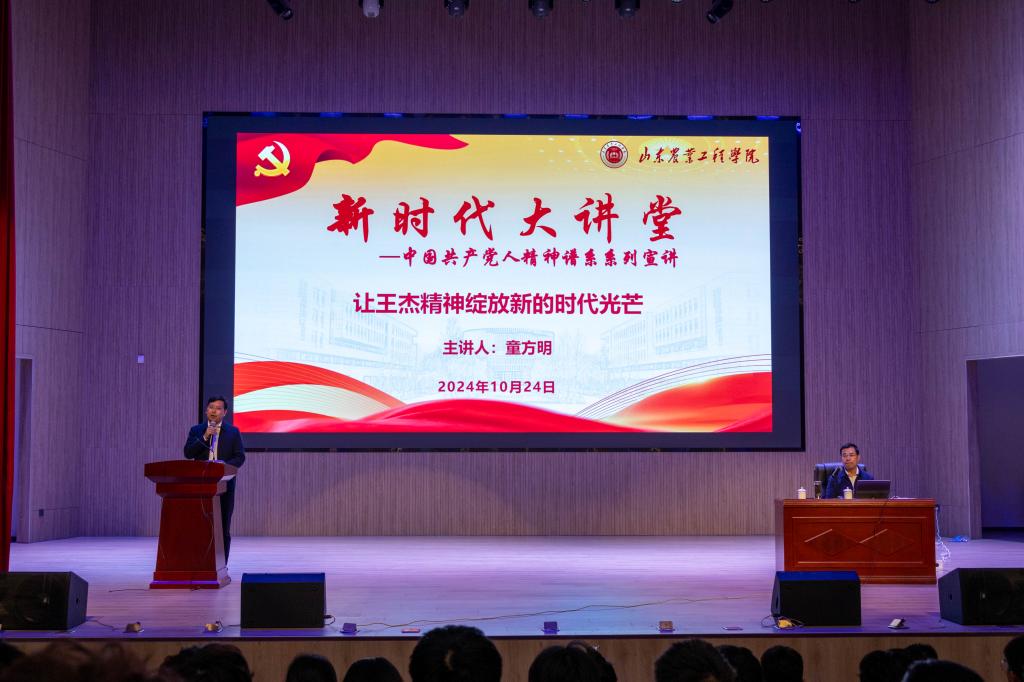 为全面贯彻落实党的二十届三中全会精神,教育引导师生在感悟中国共产党人精神谱系、体悟中华人民共和国成立75周年光辉历程中传承红色基因、赓续红色血脉,10月24日下午,由党委宣传部主办,学生工作部、马克思主义学院承办的中国共产党人精神谱系系列宣讲之王杰精神专题讲座在淄博校区大学生活动中心举办。本次讲座邀请原济宁羊山景区党工委书记、管委会主任、王杰纪念馆馆长童方明担任主讲嘉宾,各二级学院教师代表和学生骨干500余人参加。讲座由马克思主义学院党总支书记、院长周安忠主持。