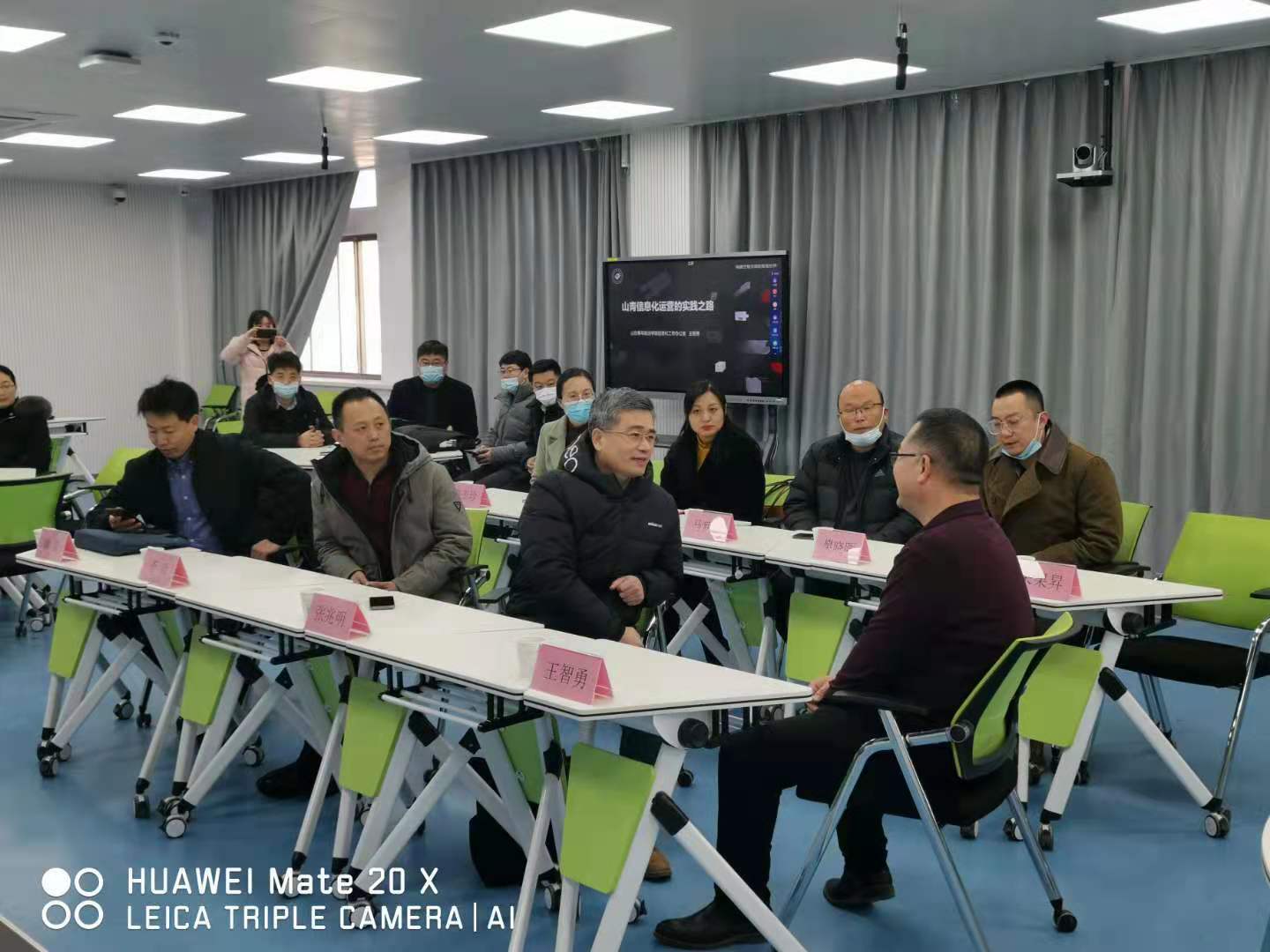 张兆明副校长一行受到了山东青年政治学院党委书记鹿林同志的热情接待,并在信息化办公室主任王智勇的带领下参观了山青院智慧教室、数据中心机房;随后,大家在新建成的智慧教室开展座谈,听取了王主任就青年政治学院智慧校园建设思路、建设目标及建设成果的汇报,并就数据治理、云服务、信息共享等问题进行了全面的沟通交流。