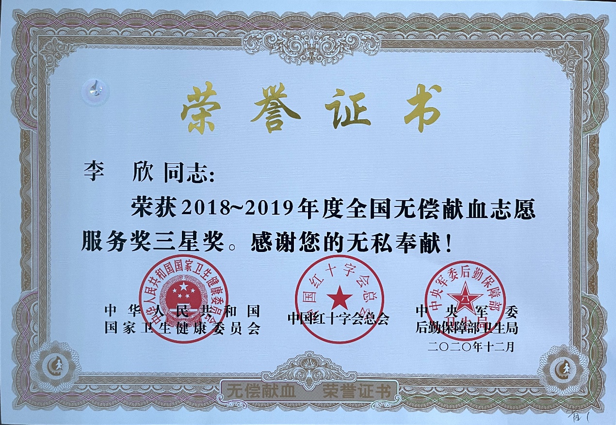 近日,中国国家卫生健康委员会、全国红十字总会、中央军委后勤保障部卫生局主办的两年一度的无偿献血志愿服务奖评定结果揭晓。437ccm必赢国际官网网络信息中心主任李欣被评为“全国无偿献血志愿服务奖三星奖”。