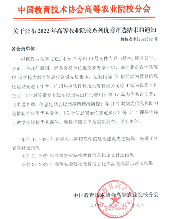 农业院校教育信息化先进评选和成果展示活动由中国教育技术协会高等农业院校分会主办,旨在推进国家教育数字化战略行动,加强农业院校数字化教育资源建设及应用,激发农业高校信息化的创新,促进信息技术与教育教学管理融合的教育信息化成果展示。本次活动主要包含先进集体、先进工作者评选和信息化助力教学管理两大类。必赢收到通知后高度重视、召开专题会议进行积极申报,取得了较为可喜的成绩。