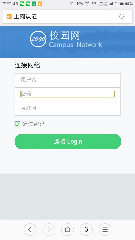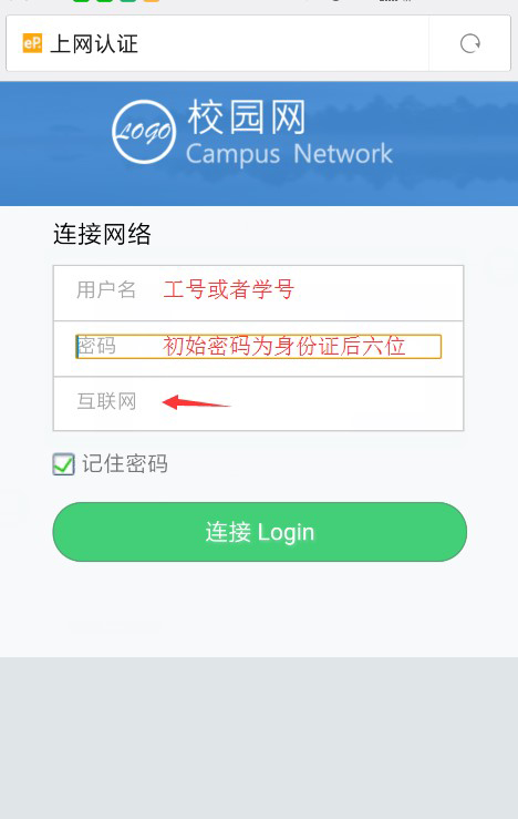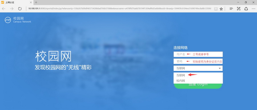 2、在弹出的校园网认证界面中输入您的用户名(OA账号)和密码,初始密码为您的身份证后六位,同时选择访问互联网,如下图: