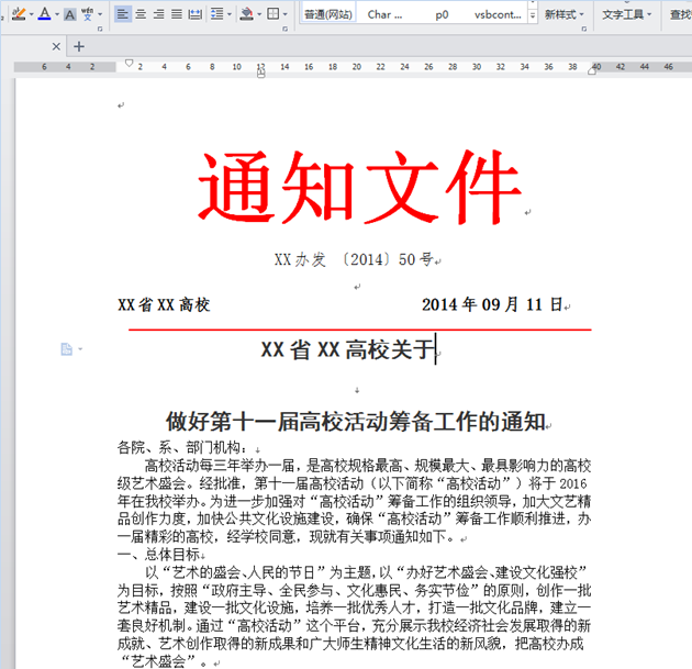 分析WORD文件,发现排版变乱的地方,没有进行规范的编辑。第一:通知文件、单位名称和编写时间使用的是两端对齐。前面说过WORD的宽度和编辑