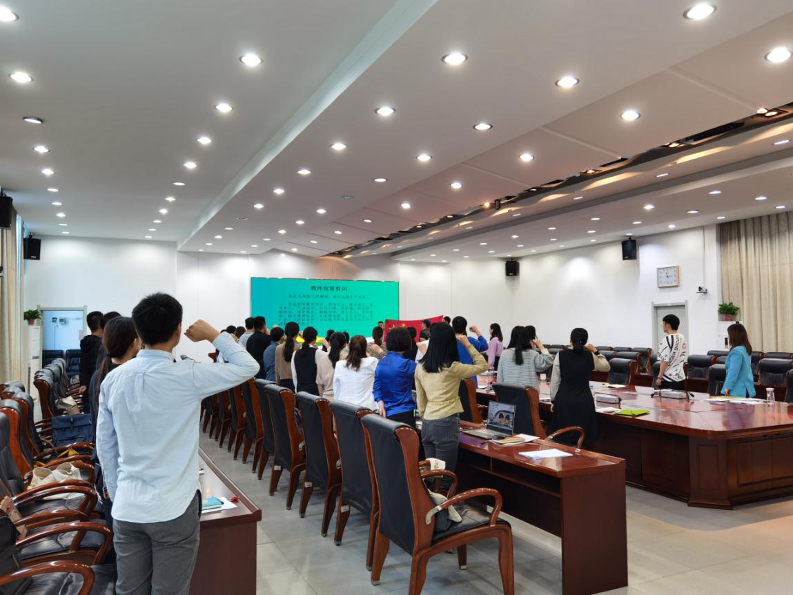 会议专门安排开展了师德师风警示教育,通报了近期在教育领域发生违反师德师风、违法违纪典型案件,要求广大教师严守职业操守,遵守新时代高校教师职业十大行为准则,争做“四有”好老师。最后,全体新进教职工面向国旗,进行了庄严的教师宣誓。