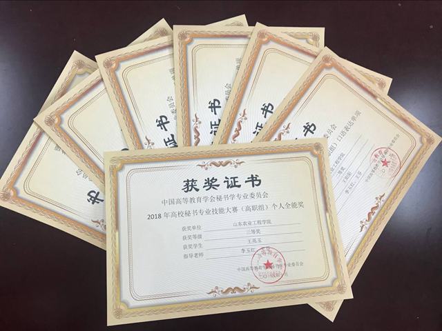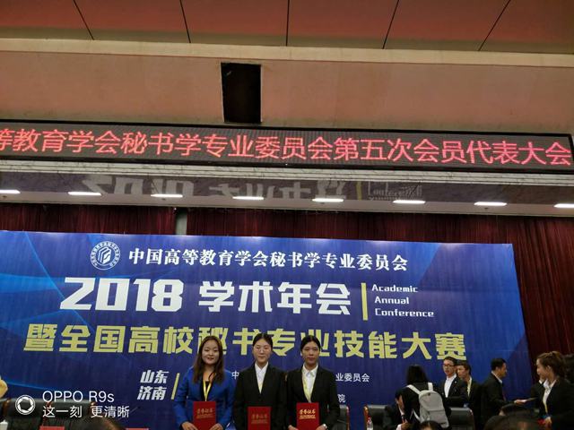 2018年10月14日-17日,由中国高等教育学会秘书学专业委员会主办、山东交通学院承办、山东管理学院协办的全国高校秘书技能大赛在山东交通学院举行,来自全国各地的四十支参赛队伍齐聚一堂,展开了激烈角逐。必赢文秘专业王兆玉、王阳阳、刘洪娜三名同学组成的代表队,首次参赛便旗开得胜,取得了单项二等奖两项、三等奖四项、个人全能三等奖一项的优异成绩。