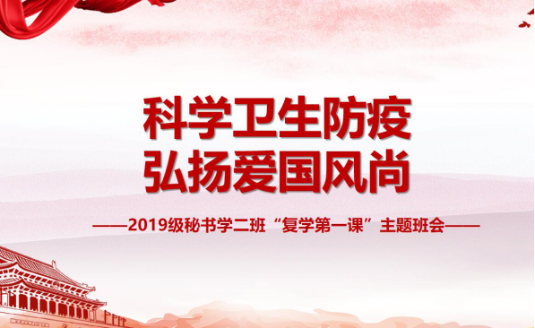 2020年5月25日下午15:30分,我院19级秘书学2班在班级QQ群召开了以“科学卫生防疫,弘扬爱国风尚”为主题的“复学第一课”网络视频主题班会。此次班会是按照学校的统一部署,按照我院复学第一课的方案的组织召开,目的是想让同学们在疫情趋于常态化的当下积极复学,保持良好学习和生活状态,学习了解卫生防疫知识,了解在此次疫情中表现英勇的医务工作者,深刻领会党和国家在此次疫情中体现出来的爱护人民、担当时代大任的不朽功绩,鼓舞同学们在新时代力争向前,更加热爱祖国。