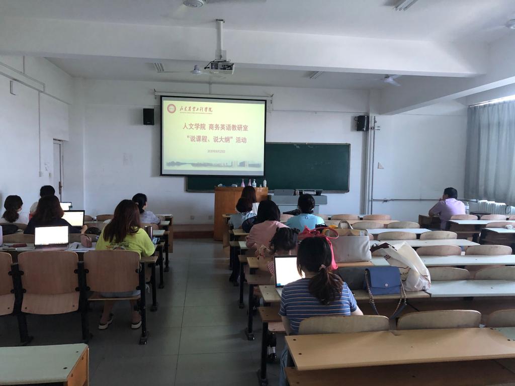 为迎接2020学年新学期到来、做好迎接本科教学评估相关工作,进一步提高教学质量,商务英语教研室分别于2020年8月25日、8月28日开展了两批说课程、说大纲活动。活动由教研室主任孟老师主持,每门课程说课时间与说大纲时间均为10分钟,由学院领导、高级职称教师进行打分。