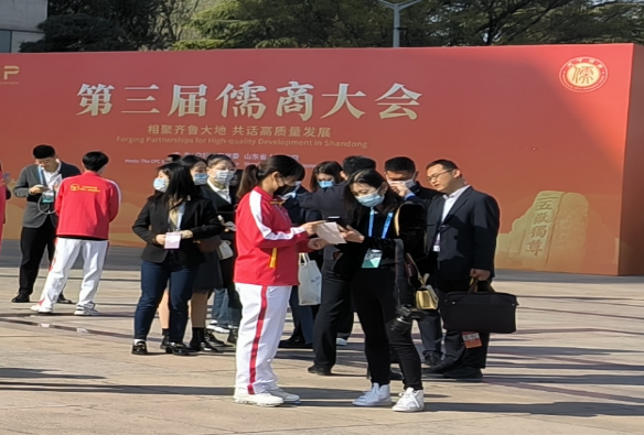 儒商大会是山东省委、省政府为推进更大范围、更高水平招商引资、招才引智,加快新时代现代化强省建设而举办的重要机制性活动,每两年举办一次。本次会议期间,学院志愿者主要承担了咨询接待、后勤保障、调查问卷发放与收集等工作。对于本次志愿服务学校高度重视,指派辅导员徐萌老师带队,全程跟进,时刻关注学生工作,定时召开碰头会,总结经验,确保了各项服务工作做实做细。高千秋院长和田芸教授参会期间看望了志愿者,充分肯定他们的努力付出,并提出了具体工作要求,针对办会应注意的细节与部分学生进行了交流。