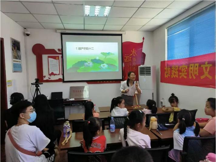 揭牌仪式结束后,我院师生为社区的学生们上了一堂生动优秀的传统文化课。李秀娟副教授以当日节气“立秋”为切入点组织学生进行了一堂以“二十四节气”为主题的精彩授课,她向学生们分享了与二十四节气相关的古诗词,并解读了这些古诗词背后的意义和文化内涵;志愿者团队的杨月莹同学也为社区学生们讲授了一堂诗歌、饮食文化课。他们以其生动的讲解、优美的语句、生动的韵律极大的吸引了学生们对传统文化的学习兴趣和热情,让学生们对中华优秀传统文化有了更深的理解和认同。
