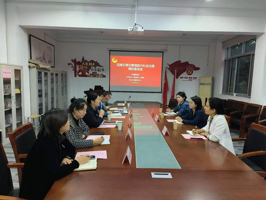 10月26日下午,共青团历城区委副书记王超慧到我院调研指导,新园社区党总支书记、居委会主任王雪慧,共青团历城区委综合科科长吴琼等3人陪同调研。学院党总支书记王纪、院长高千秋、党总支副书记戎芸婷及相关人员参加座谈。