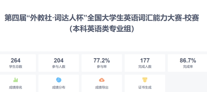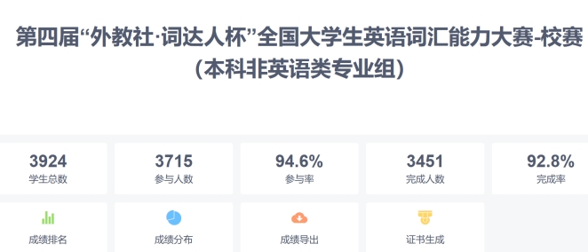 为持续推进外语智慧化教学不断深化,满足必赢学子在线英语深度学习的需求,提升学生英语学习兴趣和自主学习能力,4月18日,由我院承办、上海外语教育出版社提供技术支持的第四届“外教社•词达人杯”全国大学生英语词汇大赛--437ccm必赢国际官网校赛成功举行。全校共计3919名同学参加了此次比赛。