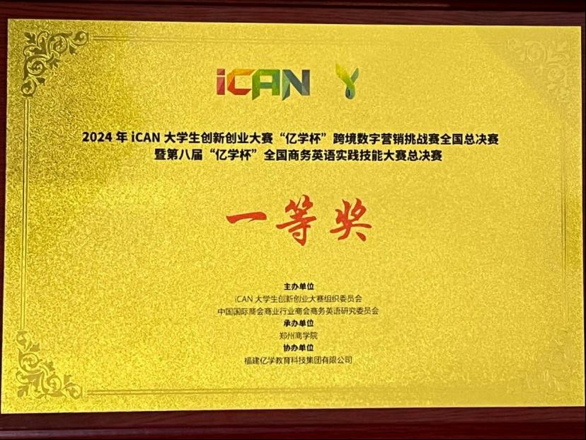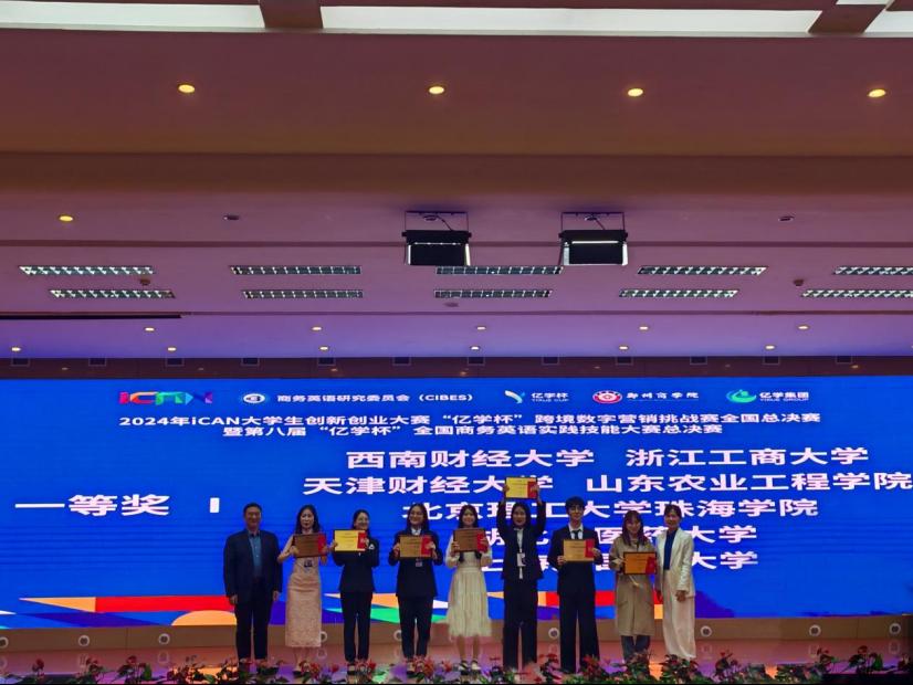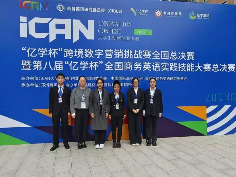 11月16日,2024年iCAN 大学生创新创业大赛“亿学杯”跨境数字营销挑战赛全国总决赛暨第八届“亿学杯”全国商务英语实践技能大赛总决赛在郑州商学院成功举办并落下帷幕,由人文学院王洁成、吕亚男老师指导的spotlight团队在全国总决赛31支参赛队伍中脱颖而出,荣获全国一等奖。