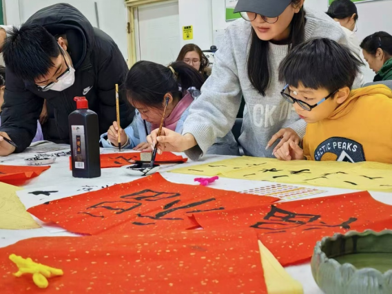 在书法体验活动中,学生志愿者们针对小朋友们的特点,深入浅出地讲解了“福”字的多种写法,从篆书的古朴典雅到隶书的蚕头燕尾,从楷书的规整严谨到行书的流畅灵动,每一种字体的展示,无不让小朋友们兴趣盎然。随后,志愿者们耐心教学,让孩子们在书写中感受中国汉字的独特魅力和传统书法艺术的博大精深。小朋友们全神贯注,一笔一划书写着新年的祝福,现场充满了浓郁的新春气息。