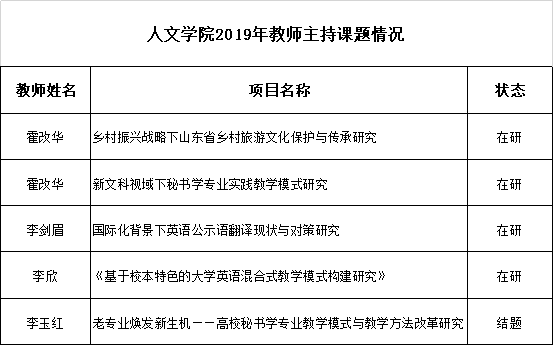 人文学院2019年教师主持课题情况统计表