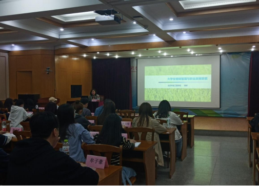 刘老师用理论联系实际,深入浅出地阐述了大学生情绪管理与职业发展要素的相关知识。她从“文科学生终生发展要素”、“情绪与健康的关系”、“幸福感的获得”等三个方面用自己对心理健康与职业规划领域的学习研究,并结合自身多年工作经验,为同学们作了精彩讲解。