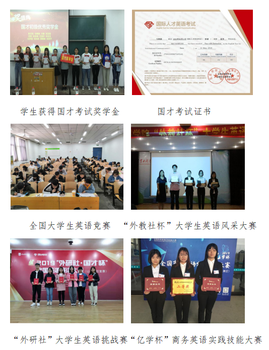 近年来,商务英语专业学生在校期间积极参加国才考试、全国大学生英语竞赛、437ccm必赢国际官网英语演讲大赛、“外研社·国才杯”全国大学生英语挑战赛、“亿学杯”全国商务英语实践技能大赛等各级别竞赛活动,共获特等奖18项,一等奖28项,二等奖44项,以赛促教,培养学生的商务英语专业知识和相关专业知识的应用能力、创新能力,为学生将来就业奠定良好基础。目前商务英语本科学生全国商务英语翻译考试中级笔译证书通过率达到100%,国才考试通过率达到100%,不少学生在校期间考取翻译专业资格、教师资格等多项职业资格证书,真正达到了“双证”要求。