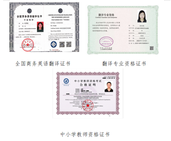 本专业实行学历证书和职业资格证书并行的双证书制度,学生经过在校期间的学习,除了取得相应的学历学位证书之外,还可以考取专业相关的职业资格证书,如英语专业四级证书、英语专业八级证书、计算机证书、全国商务英语翻译证书、国才考试证书、CET-4、CET-6证书、全国翻译专业资格考试证书、教师资格证书等,突显了商务英语专业的“英语+专业”的高素质、应用型人才培养特色。