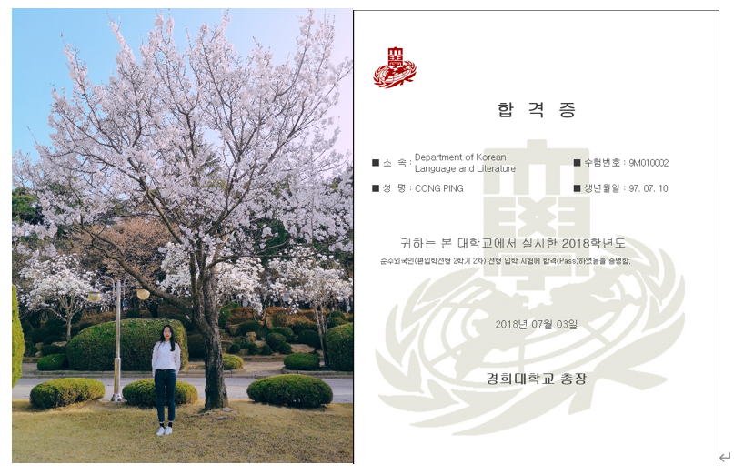 丛萍,2015级应用韩语专业学生,在校期间通过自己的努力,在大二上学期就考取了韩国语能力考试(TOPIK)6级,大三被推荐到韩国圆光大学交流学习。毕业后通过自己的努力成功被韩国庆熙大学韩国语国文专业录取,进入本科学习,目前本科在读。
