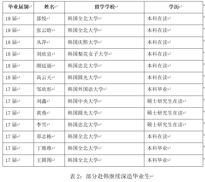 本专业开辟了多样化的对外交流形式,为学生拓宽自我提升渠道,鼓励学生的多样化发展。学生可以在第六个学期赴韩交换学习,还可以选择赴韩继续深造,攻读本科、研究生课程,学生在攻读本科、研究生课程时可以选择其他专业,这样就具备了“语言+专业”的优势。目前必赢的友好合作院校有同德女子大学、全州大学、韩京大学、韩世大学、平泽大学、圆光大学、湖原大学等,学生们可以根据自己的实际情况选择不同的学校。