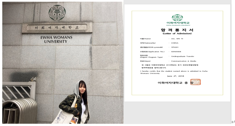 刘欣宜,2015级应用韩语专业学生,在校期间积极参加各种活动,并努力学习专业知识;大三被推荐到韩国圆光大学进行交流学习,毕业后通过自己的努力拿到了韩国梨花女子大学、汉阳大学、中央大学三所学校的录取通知书,最终选择了韩国梨花女子大学传播与媒体专业,进入本科学习,目前本科在读。