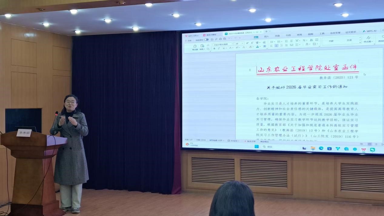 会上,李秀娟详细传达了学校《关于做好2026届毕业实习工作的通知》精神,并就实习工作进行系统部署。她指出,学院将严格落实“双指导教师”制度,加强过程管理,同时就实习平台使用、周志提交、实习报告撰写等环节作出说明,并着重强调了实习期间的安全纪律与规范要求。