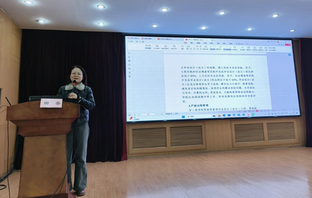 田芸教授传达了学校《关于做好2026届本科毕业设计(论文)工作的通知》精神,系统重申了学校及学院关于毕业论文的管理办法与时间节点,对选题开题、文献综述、中期检查、论文评审与答辩等环节进行了清晰梳理。她还结合秘书学专业特点,强调选题应立足社会实际与职业需求,要在通过论文写作进一步强化文献检索能力、学术表达能力和解决实际问题的综合能力。最后重点强调了学术道德与写作规范,要求全体学生坚守学术诚信底线,在格式、引用、论证等方面做到严谨、规范。