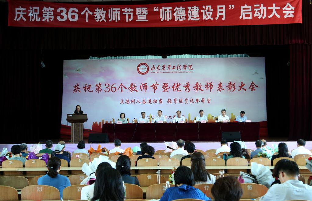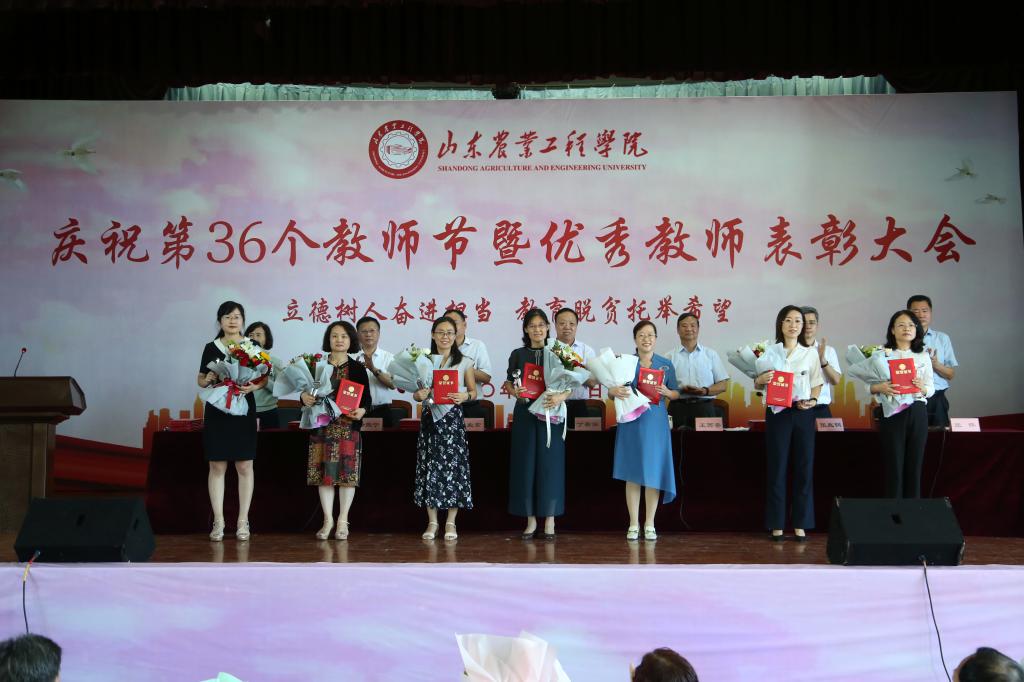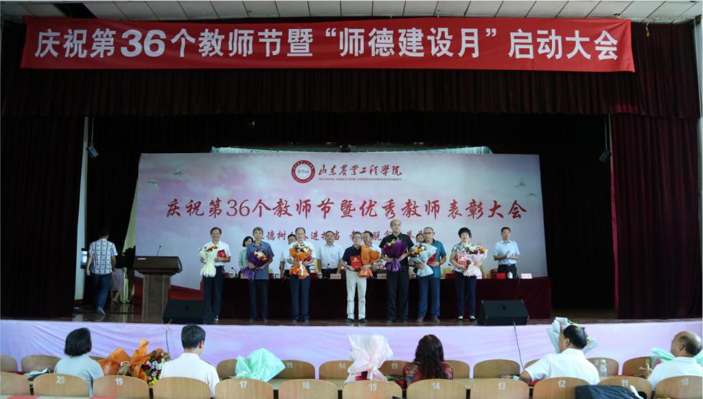 张业赏宣读了学校从教三十年及以上在职教师人选名单和校党委关于“最美教师、师德标兵、优秀教师、优秀教育工作者”表彰决定,全体校领导班子成员为受表彰的个人颁奖。随后,全体与会教师面向国旗,举起右拳,进行了庄严的教师宣誓。