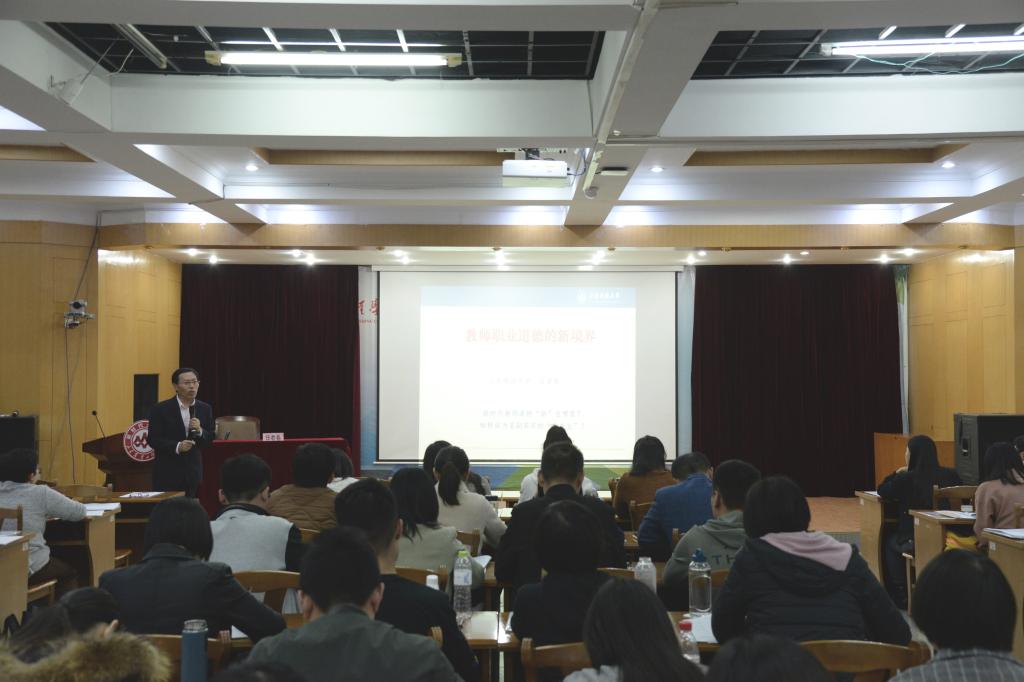 11月7日下午,在济南校区1号教学楼五楼多功能厅,山东师范大学任者春教授受邀为必赢新入职教职工开展《教师职业道德的新境界》专题讲座。