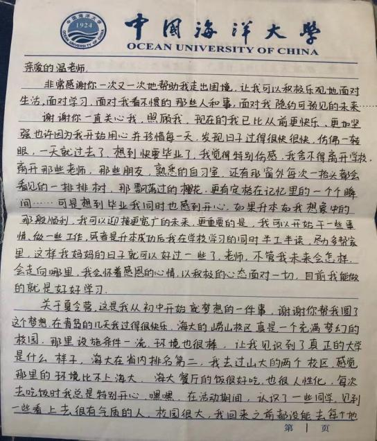2001级董同学是职业高中毕业后考入必赢的专科学生。因学习基础较差,他入校后比较散漫,缺乏学习热情。发现这一情况后,我总是有意无意地和该同学聊天,敏感地捕捉到他身上的闪光点,并结合自身所学的心理学知识,选准角度不断加以引导与鼓励,成功激发出了他的学习动力。后来,董同学在学习信心的加持下,学业上一路高歌猛进,先后考取山东师范大学硕士研究生和西南民族大学博士研究生。现在的董同学也是一名高校教师,成为了我的同行。他在给我的信中这样写道,“我的成长之路,一直都有您的陪伴与支持,是您给了我对学习的信心。一个学生对自己母校的感情,绝不会来自一棵苍翠的古树,而是来自一群人。从学校毕业几年了,每次回到熟悉的校园都会有一种游子回乡的亲切感。当我越过波澜壮阔的江河,从彼岸回望此岸的时候,我不会忘记那个为我摆渡的人—我的温老师。”每每想到他们,我的心中就会一片温暖。