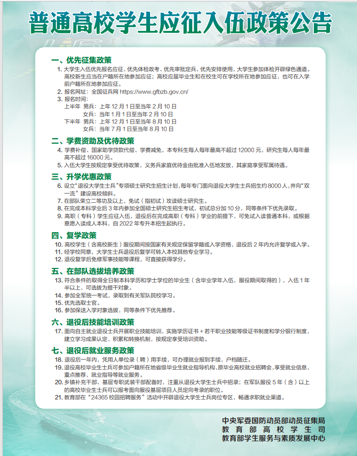 普通高校学生应征入伍政策公告