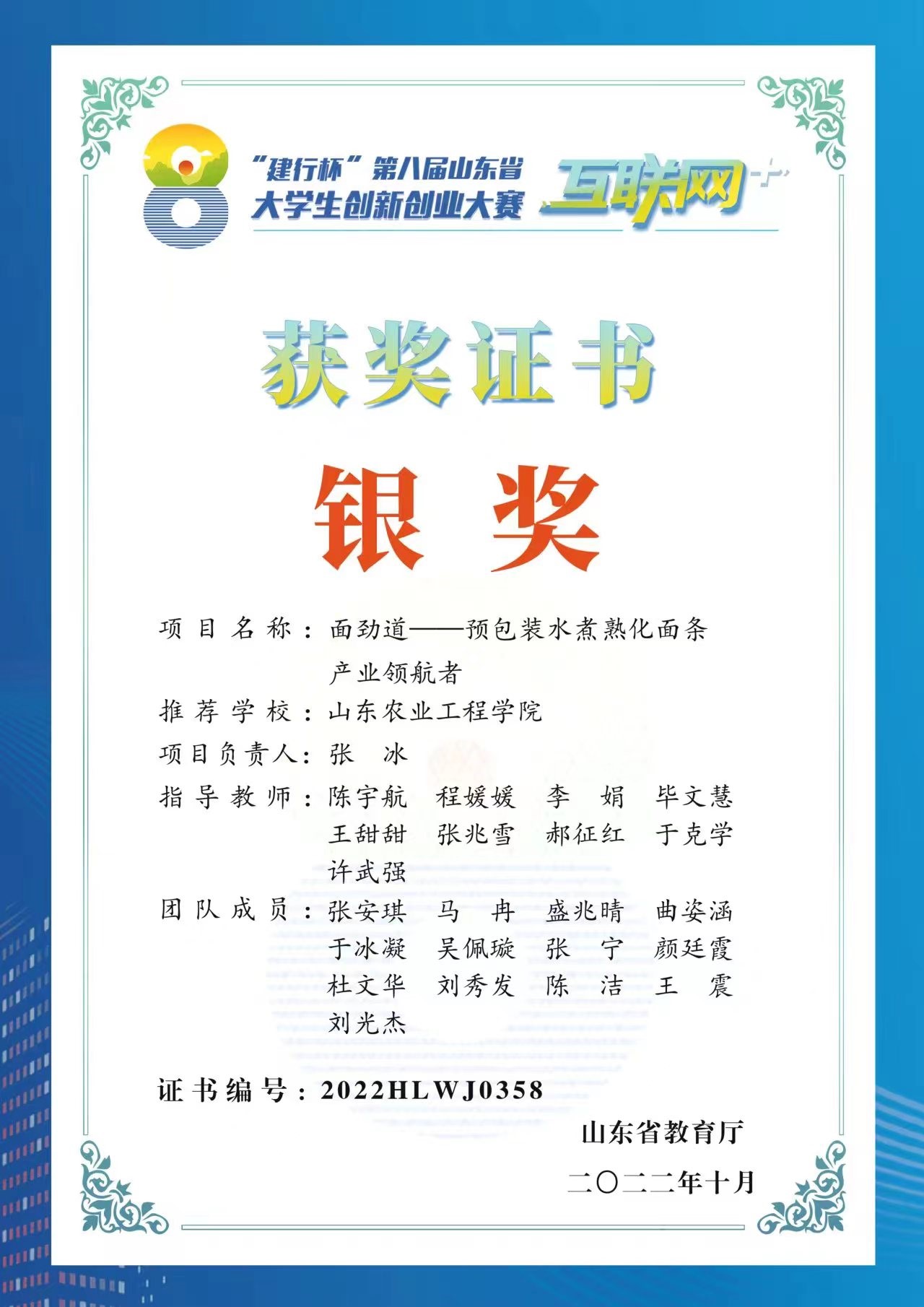 “互联网+”大学生创新创业大赛是深化创新创业教育改革的重要载体和关键平台,成为覆盖全国所有高校、面向全体大学生、影响最大的高校双创盛会,多年来,围绕“更中国、更国际、更教育、更全面、更创新”的总体目标,培养了一大批有理想、有本领、有担当的源源不断的青春力量。为响应国家号召,深入推进大众创业、万众创新,推动高等教育高质量发展,加快培养创新创业人才,我院积极引导同学们参加“互联网+”大学生创新创业大赛,近年来,我院学子在比赛中屡屡创得佳绩,今年,以张冰同学为团队负责人的“面劲道——预包装水煮熟化面条产业领航者”项目获得“建行杯”第八届山东省“互联网+”大学生创新创业大赛银奖。在此次比赛中,参赛师生全心投入、精心打磨参赛项目,用实际行动对“厚德、自强、求是、笃行”的校训进行了诠释。食品学院将以此次参赛为契机,引领广大青年学子脚踏实地,锐意进取,在创新创业中了解发展,锤炼意志品质,增长智慧才干,承担时代使命,书写出无愧于时代、无愧于历史的华彩篇章。